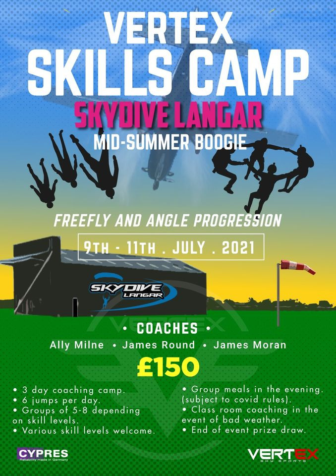On this camp you will be organised into groups of 5-8 with similar progression goals and skill levels. You will jump for 3 days with the aim to complete 6 jumps per day with your group. Each day your group will change organiser to give some different coaching on each day and a wide range of styles and experience. The Vertex Skills camp is aimed at a wide range of experience levels from beginner/intermediate freefly and tracking up to more advanced flyers. With the excellent skill sets of our coaches we will work with your group to constantly push your learning and level up those flying skills in a fun and
