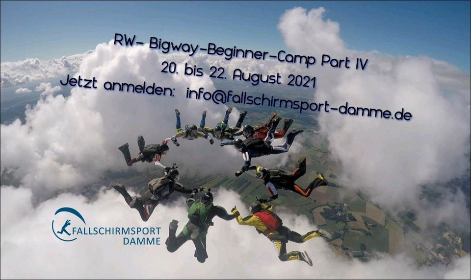 Nach dem großen Zuspruch, dem Erfolg und der Begeisterung der Fallschirmspringer für das RW-Bigway-Beginnercamp in 2020, werden wir auch 2021 zwei Veranstaltungen anbieten. Die Jeweiligen Camps finden vom 23. bis 25. April und vom 20. bis 22. August 2021 statt. Für das Camp werden zwei Gruppen nach ihrem Erfahrungsstand gebildet. Ziel des Camps ist es, dass aus diesen zwei Gruppen eine RW-Großformation mit zwölf Personen zusammen gebildet wird. Der Kurs startet jeweils am Freitagnachmittag um 17 Uhr mit der Theorie. Samstags und sonntags wird dann ab 9 Uhr aus dem Flugzeug gesprungen.