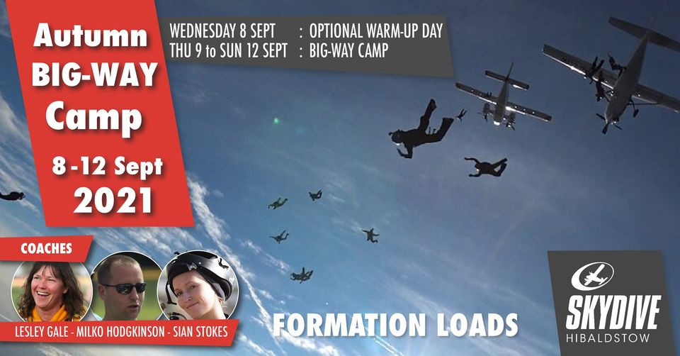 Lesley, Milko & Siân are coaching at Skydive Hibaldstow for 4 days of big-way fun and learning. Thursday 9 September we will jump in groups of 14 plus camera, with an organiser or plane captain, from Hib’s Turbine G92. We will move to 28-ways (or 30-ways) from two planes Friday to Sunday, playing with different elements of big-way formations. We achieved multiple point 28-ways and completions on the last camp and expect to build on this success. We will mostly be slotting jumpers at the start to their strong positions but there will be flexibility to try something new also.