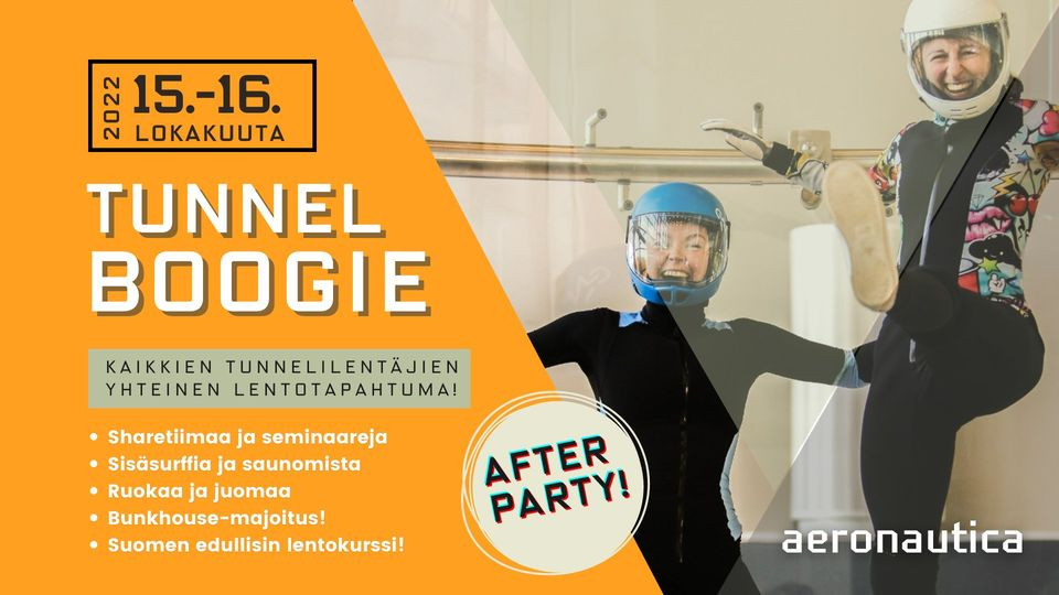 Aeronautica Arena organizes the next Tunnel Boogie on 15-16 October 2022! This popular event is aimed at all skydivers and wind tunnel pilots or those who want to become one! The goal is to fly a lot in a shared team, to talk about aviation topics that are burning during the day, and in the evening to surf and dance!